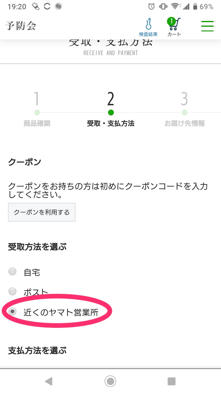「受け取り方法を選ぶ」で「近くのヤマト営業所」を選び支払い方法を選択して次へ進んでください