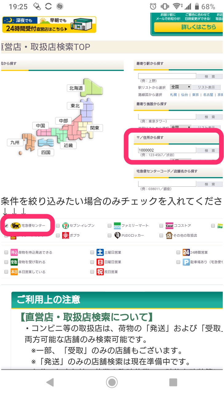 「郵便番号から探す」の入力欄に現在お住まいの郵便番号を入力し、さらに「条件を絞り込みたい場合のみ〜」にある「宅急便センター」にチェックし、検索を押してください