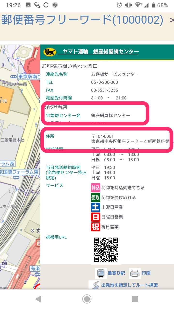 地図上から受け取りたい営業所を選択すると詳細画面が表示されますので、営業所名、郵便番号、住所をコピペするなり、メモするなりして先のクロネコヤマトの営業所情報の入力欄に入力しくし、申込みを行えばクロネコヤマトの営業所で受け取れます。